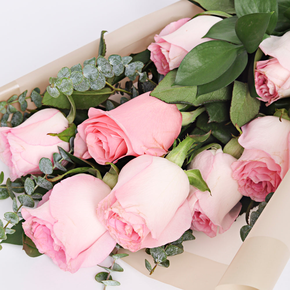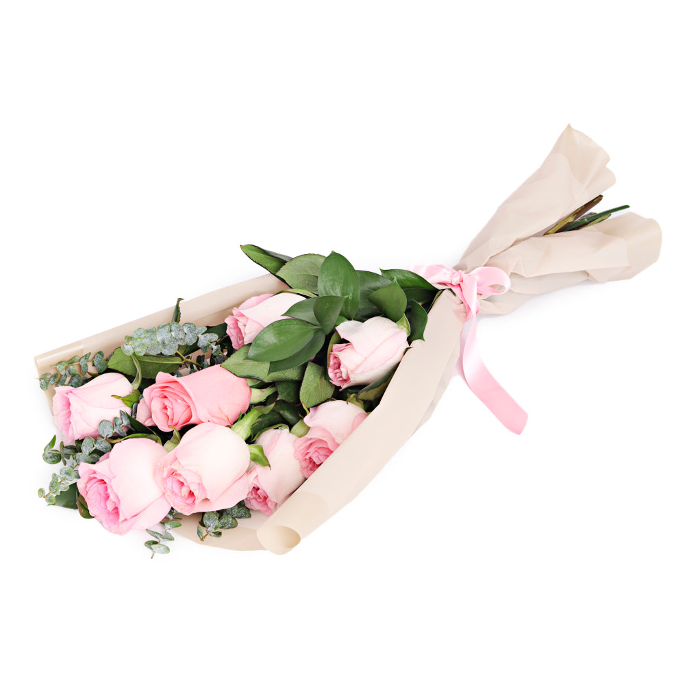 Bouquet de 9 rosas decorado. La foto es referencial, el tono del color y el follaje puede variar según disponibilidad